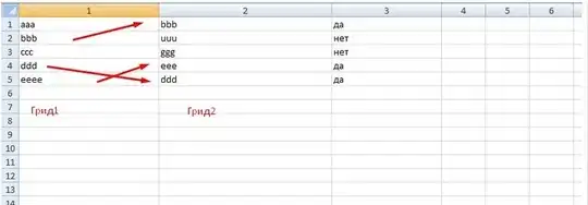 Нужно пройтись по каждому 1-му столбцу и сравнить ячейки,при совпадении записать в 2-й столбец 2-го грида например "Да" или нет если несовпало