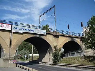 - ↑ Пассажирские перевозки до станции Тешнов закончились 1.07.1972. Прекрасное здание нео-ренессансной станции, спроектированное Карлом Шлимпом, было снесено 16.03.1985.