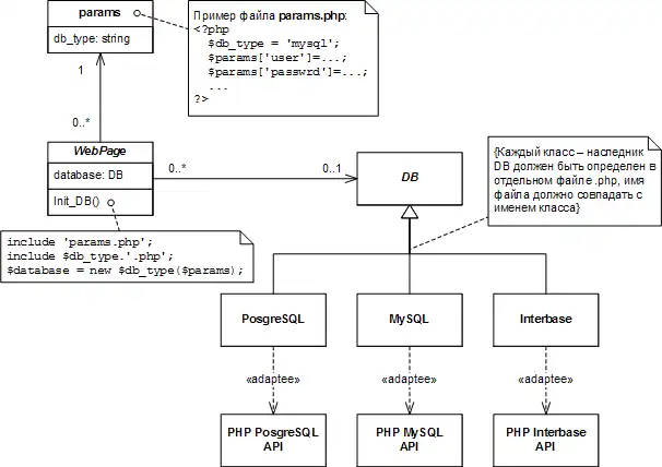 - ↑ В устаревших версиях языка PHP доступ к СУБД реализован в виде набора функций, для каждой СУБД они имеют различные наименования и, иногда, различный набор используемых параметров, что приводит к значительным проблемам при переходе с одной СУБД на другую, если такой переход заранее не обеспечен использованием шаблона Адаптер.