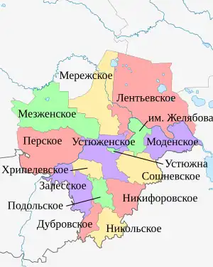 Устюженский муниципальный район в рамках организации местного самоуправления включает 8 муниципальных образований нижнего уровня, в том числе 1 городское и 7 сельских поселений[9]