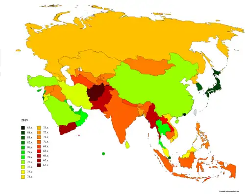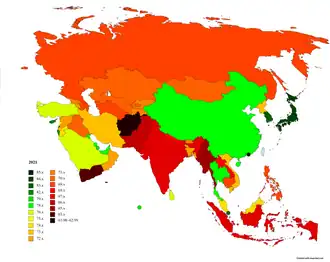 В Азии происходит постепенное снижение рождаемости и рост пожилого населения. Это происходит из-за общемирового процесса старения населения Земли (кроме Африки южнее Сахары) и уже вызванного им в ряде стран (как развитых, так и развивающихся) демографического кризиса. Наиболее сильно старение населения наблюдается в странах Восточной Азии (кроме Монголии). Наряду с со странами Европы и некоторыми странами Юго-Восточной Азии (такими как Сингапур и Таиланд), они имеют самый высокий средний возраст населения, поэтому там происходит наиболее быстрое старение населения на Земле. В отличие от стран Европы, страны Восточной Азии зачастую практикуют более строгую иммиграционную политику; она не позволяет им притормаживать процессы естественного старения населения, и, как следствие — процессы растущей смертности и естественной убыли населения, а также роста среднего возраста населения[35][36][37][38][39][40][41].