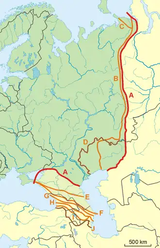 Граница Европы и Азии, признанная и используемая Международным Географическим Обществом (под буквой «A»[12], под другими буквами отвергнутые варианты). Некоторые источники (в частности, американские) до сих пор склоняются к использованию границ под буквами «B» и «F»[13].