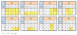 - Рассматриваем все ячейки карты Карно в порядке возрастания количества единиц в их кодах. Для функции трёх переменных последовательность ячеек будет 000—100 — 010—001 — 110—101 — 011—111. Каждой ячейке карты Карно сопоставляем член полинома Жегалкина в зависимости от позиций кода, в которых стоят единицы. Например, ячейке 111 соответствует член ABC, ячейке 101 — член AC, ячейке 010 — член B, ячейке 000 — член 1.