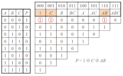 - Если в рассматриваемой ячейке находится 1, добавляем в полином Жегалкина соответствующий член, инвертируем в карте Карно все ячейки, где этот член равен 1, и переходим к следующей ячейке. Например, если при рассмотрении ячейки 110 в ней оказывается единица, то в полином Жегалкина добавляется член AB и инвертируются все ячейки карты Карно, где A = 1 и B = 1. Если единице равна ячейка 000, то в полином Жегалкина добавляется член 1 и инвертируется вся карта Карно.