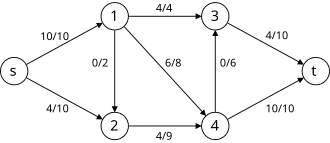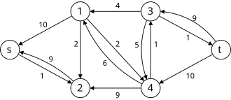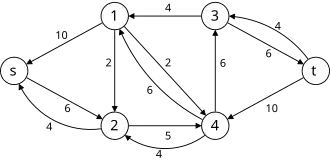 Следовательно, блокирующий поток содержит 14 единиц, а величина потока равна 14. Заметим, что дополняющий путь имеет 3 ребра. | |||