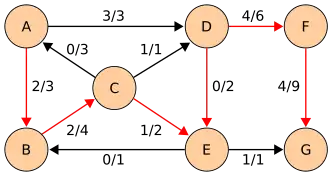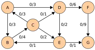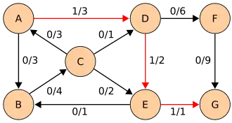 Пусть задана сеть с истоком в вершине и стоком в вершине . На рисунке парой обозначен поток по этому ребру и его пропускная способность.