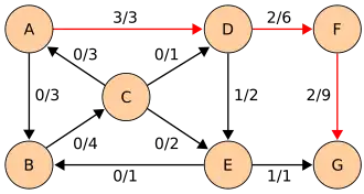 - Для каждого ребра на найденном пути увеличиваем поток на , а в противоположном ему — уменьшаем на .