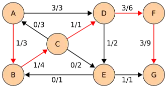 - На найденном пути в остаточной сети ищем ребро с минимальной пропускной способностью .