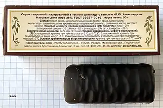 Сырок творожный глазированный в тёмном шоколаде с ванилью «Б. Ю. Александров» и картонная упаковка к нему, 2.12.2020.