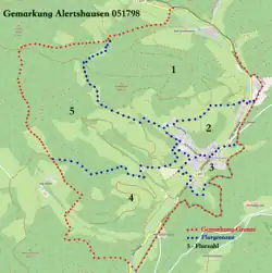 Территория поселения в земельном кадастре Германии носит код 051897 (05 — код земельного кадастра Северного Рейна-Вестфалии) и называется «Гемаркунг Алертсхаузен 051879». Этот земельный кадастровый район разделён на 5 подрайонов (флюры 1-5), которые, в свою очередь делятся на земельные участки (флюрштюки). Всего в гемаркунге Алертсхаузена насчитывается 171 земельный участок.[2]
