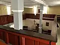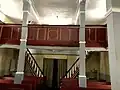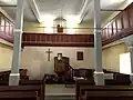 Внутреннее помещение с галереями со всех четырёх сторон покрыто плоским потолком. Кафедра для проповеди установлена прямо за престолом.