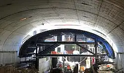 Запроектированный архитекторами гладкий, без кессонов эллипсоидный свод предъявлял высокие требования к качеству бетонируемой поверхности. Поэтому особое внимание было уделено формообразующей части опалубочной конструкции. Она была изготовлена из высококачественной ламинированной фанеры, стабильно закрепленной на каркасе из алюминиевых балок MEGAFORM Al. Последний, 18-й участок свода был забетонирован бригадой Александра Ларина из СМУ-3 «Метростроя» точно в соответствии с графиком — в июле 2012 года. В августе строители приступили к отделочным работам и обратной засыпке[36]. В декабре 2012 были завершены все архитектурно-отделочные и инженерные работы, тестирование и пусконаладка всех систем.