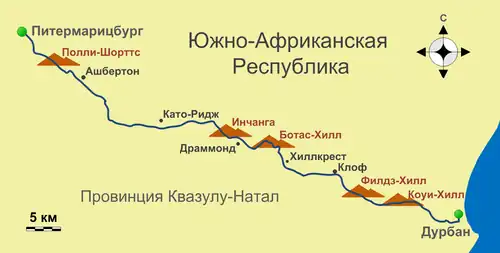Маршрут гонки по большей части повторяет сверхмарафон The Comrades из Питермарицбурге в Дурбан. До начала 2000-х годов протяжённость дистанции не дотягивала до 100 км. С целью преодолеть эту отметку была изменена начальная часть маршрута которая стала обходить Ашбертон, а общая протяжённость дистанции стала составлять 106 км. Сразу после старта в Питермарицбурге на высоте 650 м начинается сложный 14-километровый подъём до Торнвилля где дистанция достигает своей наивысшей точки в 950 м, после чего возвращается на привычный маршрут в районе Кампердаун. Далее следуют Като-Ридж, Инчанга, Ботас-Хилл. После этого трасса начинает спускаться к Дурбану расположенному на берегу моря где находится финиш гонки. [1]