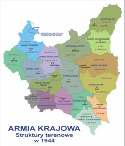 Основной единицей в АК в 1942—1943 годах был принят взвод, в июле 1943 года комендант АК приказал соединять взводы в роты и в батальоны. В основе подпольной организации AK лежал принцип территориально-административного деления. Административно-территориально территория Польши была разделена на обшары/территории (несколько воеводств), включавшие несколько округов (территорий бывших воеводств), инспектораты (несколько повятов), обводы — территории бывших повятов, районы и другие более мелкие территориальные единицы AK. К весне 1944 года были созданы 4 обшара (территории), 16 округов, 8 подокругов, 83 инспектората, 286 обводов AK.