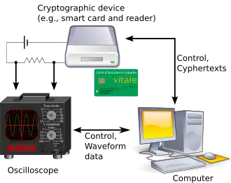 Необходимое для атаки по энергопотреблению оборудование широко доступно. Например, большинство цифровых осциллографов имеют необходимую для получения данных для обработки функциональность, а сами данные обычно обрабатываются на персональных компьютерах. Также доступны коммерческие продукты, разработанные для лабораторий тестирования.[4] Несмотря на то, что современные микропроцессоры работают на частотах порядка 3 ГГц, в некоторых ситуациях для успешного анализа достаточно измерительных приборов с частотой дискретизации порядка десятков кГц.[5] В качестве источника сигнала о энергопотреблении может выступать как непосредственно ток в канале передачи энергии от источника питания к устройству (например, в сетевом шнуре), так и напряжение на поверхности корпуса, напряжение на различных интерфейсах (USB, сетевой вход, VGA и т. п.) и даже электромагнитное излучение.