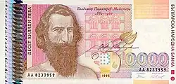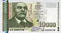 10 000 | 112×62 | оливково-зелёный | портрет учёного Петра Берона | эскизы научных трудов и телескоп | лев с герба Болгарии | 27.10.1997 |