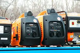 - инверторные портативные бензиновые генераторы мощностью до 1 кВт — могут выполняться в виде небольшого чемоданчика, удобного для домашнего использования или при транспортировке, используются при малой интенсивности потребления электроэнергии в домашних или загородных условиях, зачастую оснащаются двухтактными двигателями.