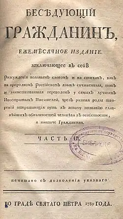 В декабрьском номере «Беседующего гражданина» была опубликована неожиданно острая статья под названием «Беседа о том, что есть сын Отечества», начинавшаяся словами: «Не все рождённые в Отечестве достойны величественного наименования сына Отечества (патриота). Под игом рабства находящиеся недостойны украшаться сим именем».