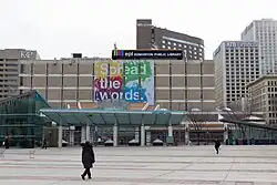 Библиотека Стэнли А. Милнера - самая большая и одна из самых загруженных публичных библиотек Эдмонтона . Зданию было уже более 50 лет, и оно уже не полностью удовлетворяет запросы современной библиотеки. Как это часто бывает со многими бруталистскими зданиями Эдмонтона той эпохи, открытый бетон и другие материалы в библиотеке начали разрушаться из-за долгих лет выветривания. Ощутимо старение конструкций систем жизнеобеспечения: проблемы с вентиляцией и потерь тепла. Кроме того, возникли проблемы с безопасностью в отношении парадного входа в библиотеку, выходящего на Черчилль-сквер.[13] Узкий тротуар и оживленная автобусная остановка прямо у входа на 102 Avenue привели к множеству пробок и проблем с безопасностью.