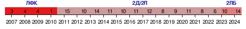 | 2019/20 | 9 из 16 | 19 | 7 | 5 | 7 | 20-22 | 26 | 1/64 | итоги утверждены по промежуточным показателям[d] | |||