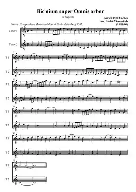 - Articles "bicinium," "tricinium" in The New Grove Dictionary of Music and Musicians, ed. Stanley Sadie. 20 vol. London, Macmillan Publishers Ltd., 1980. ISBN 1-56159-174-2
