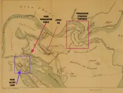 На западном берегу реки Парагвай полковник Бернардино Кабальеро построил линию крошечных редутов между фортом Тимбо и участком между позициями войск на полпути к Андаи, занятом союзниками. На этой последней позиции, которую парагвайцы называли Редукто-Кора, полковник разместил батальон пехоты (500 пеших кавалеристов) который совершал почти ежедневные набеги на союзников.