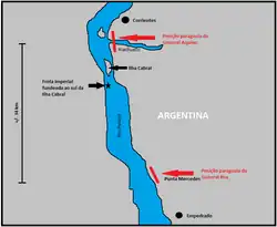 Затем парагвайский командующий Хосе Мария Бругес решил расположить свою артиллерию между стоянкой имперской эскадры и устьем эстуария, чтобы отрезать её коммуникации, поэтому он переместил свои батареи в Пунта-Мерседес, примерно в 15 км к северу от Эмпедрадо (Корриентес), на отметке 1157 км реки Парана. У выбранной позиции ширина реки была менее 2 км, а берег высотой около 20 м, что позволяли ему господствовать над проходом с помощью своей артиллерии. У Брюгеса было 22 орудия, которые он получил после боя при Риачуэло. Его поддерживали три пехотных батальона под командованием майора Акино и кавалерийский эскадрон, всего 3000 человек.
