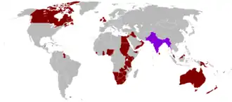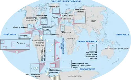 Территории, когда-либо бывшие частью Британской империи. Названия Британских заморских территорий подчёркнуты красным