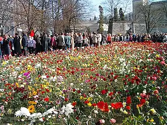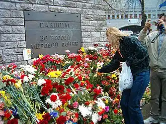 Утром на площади стали собираться люди и возлагать цветы к металлическому забору. Полицейские приказали их убрать, но после небольшого совещания цветы разрешили оставить.