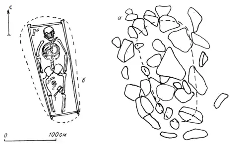 В 1973 году неподалёку от этого поселения И. В. Асеевым, который проводил раскопки в 1973—1974 годы, было найдено древнемонгольское захоронение датируемое развитым средневековьем[3][2][8]. И. В. Асеевым было исследовано девять погребений[8], в шести из них были найдены человеческие останки[9]. Сохранилось 18 надмогильных кладок, не подвергавшихся раскопкам[3].