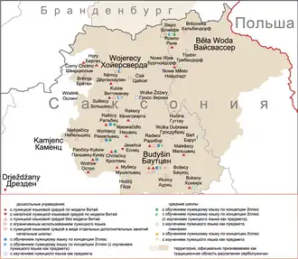 Для верхнелужицкого ареала, занимающего сравнительно небольшую территорию, характерна значительная диалектная дробность. Выделяются следующие основные диалекты[13][30]: