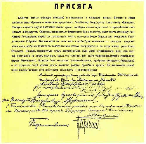 «Клянусь честью офицера (солдата) и обещаюсь перед Богом и своей совестью быть верным и неизменно преданным Российскому Государству, как своему Отечеству. Клянусь служить ему до последней капли крови, всемерно способствуя славе и процветанию Российского Государства. Обязуюсь повиноваться Временному Правительству, ныне возглавляющему Российское Государство, впредь до установления образа правления волею народа при посредстве Учредительного собрания. Возложенные на меня служебные обязанности буду выполнять с полным напряжением сил, имея в помыслах исключительно пользу государства и не щадя жизни ради блага Отечества. Клянусь повиноваться всем поставленным надо мною начальникам, чиня им полное послушание во всех случаях, когда этого требует мой долг офицера (солдата) и гражданина перед Отечеством. Клянусь быть честным, добросовестным, храбрым офицером (солдатом) и не нарушать клятвы из-за корысти, родства, дружбы и вражды. В заключение данной мною клятвы осеняю себя крестным знамением и ниже подписываюсь»
