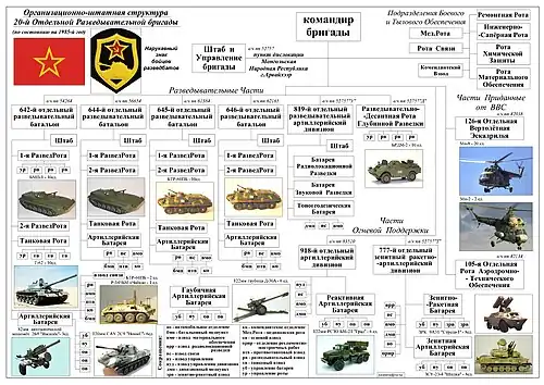 Эти разведывательные бригады отличались от бригад специального назначения как штатом, так и вооружением. К примеру, 20-я отдельная разведывательная бригада имела следующий состав[1]: