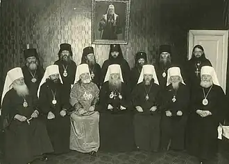 Зимняя сессия 1934/1935 годов. 1 ряд (слева направо): митр. Ярославский Павел (Борисовский), митр. Одесский Анатолий (Грисюк), митр. Ташкентский Арсений (Стадницкий), митр. Московский Сергий (Страгородский), митр. Ленинградский Алексий (Симанский), митр. Казанский Серафим (Александров), митр. Киевский Константин (Дьяков).