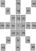 | Компас | Предназначен для гадания по вопросу «Что будет, если…» с несколькими альтернативами. | Карты выложены в форме n-лучевой звезды, где n — число рассматриваемых альтернатив. На иллюстрации показан полный вариант расклада, на 8 альтернатив. При выкладывании карт каждому лучу (четвёрка карт, от 1 до 4буква) ставится в соответствие один из предполагаемых вариантов действий. Карты выкладываются от 1, сначала все 2, по часовой стрелке, затем все 3, затем все 4. Карты на луче (1 — общее для всех начало) означают, в применении к соответствующей альтернативе: 1) Текущая ситуация. |