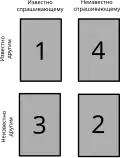 | Слепое пятно | Расклад предназначен для гадания о характеристиках личности, о качествах и свойствах, которые человек демонстрирует и скрывает. | Расклад расшифровывается как таблица 2x2, где столбцы именуются «Известно спрашивающему» и «Неизвестно спрашивающему», а строки — «Известно другим» и «Неизвестно другим». Соответственно, расшифровки карт: 1) Осознаваемая и демонстрируемая часть личности — то, что о знают о спрашивающем и он сам, и другие. |