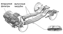 - ↑ В изображении неточность: единственная батарея расположена спереди, по центру кожуха впускного фильтра. Одной батареи не хватало, поэтому в опытной серии ставили две батареи — не под капот, а в багажник