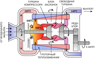 Режим работы двигателя управлялся как плавно, автоматом подачи топлива и углом установки лопаток соплового аппарата, так и ступенчато — отсечкой подачи топлива. Когда водитель убирал ногу с педали газа, автоматика отключала подачу топлива, но двигатель продолжал работать: некоторое время вращение поддерживала остаточная тепловая энергия, накопленная роторами теплообменников. При последующем нажатии на педаль газа подача топлива восстанавливалась. В отличие от авиационных турбомоторов свеча, поджигавшая топливо, была подключена к магнето постоянно, поэтому горение возобновлялось почти без задержки[52][53]. Смазка машинным маслом, привычная в поршевых двигателях, в ГТД могла применяться только в относительно слабо нагруженных узлах (редукторы, привод регенератора). В подшипниках турбинных валов, работавших при высоких оборотах и высоких температурах, конструкторы применили газовые подшипники. Воздух в зазоры подшипников, толщиной в несколько микрон нагнетался самими турбинами[54].