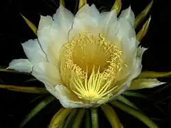 Цветки крупные, длиной до 25—30 см[3] и диаметром около 20 см; открываются ночью[4], ароматные[5]. Цветочная трубка воронкообразная, без колючек[2], покрыта чешуйками[4]. Чёткой дифференциации листочков околоцветника на чашелистики и лепестки нет. Листочки чашечковидной части околоцветника — с зеленоватой центральной жилкой и белым (большей частью) краем, с заострёнными верхушками, отогнутые, по форме — от ланцетно-линейных до линейных, от 10 до 15 см в длину и от 1 до 1,5 см в ширину, с цельным краем. Листочки венчиковидной части околоцветника — белые, узко-обратноланцетовидные[3].