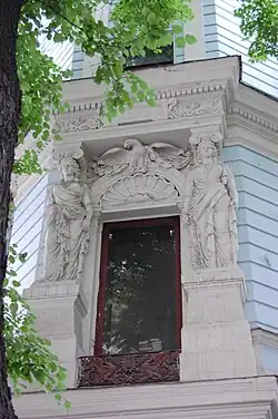 Рустованные фасады дома выполнены в формах эклектики. Со стороны улицы Знаменки выступает ризалит парадного крыльца, который декорирован муфтированными колоннами, соединёнными с оградой. На уровне второго этажа композиция объединена с балконом, окно которого украшено ионическим колоннами и треугольным фронтоном. На втором этаже окно срезанного юго-восточного угла дома фланкировано двумя кариатидами. Они поддерживают волюты ионического ордера. Между статуями расположен наличник, оформленный в виде раковины[2][4].