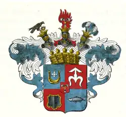 В щите, расчетверённом с баронской короной, накинут щиток, в красном поле которого из-под золотой византийской монеты выходят три страусовых пера, два к верхним углам щитка, а третье вниз; в полях главного щита накрест голубых и красных, в первом, голубом, серебряный кавалерский крест, полуокружённый снизу золотой подковой; во втором серебряное железко, остриём вверх с крючками, загнутыми вниз наподобие усов; в третьем немецкий щит с золотым ободком, а в четвёртом серебряная рыба головой вправо.