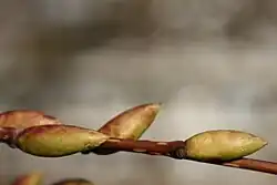 Почки ланцетные, острые, длиной 7—13 мм. Листья сильно гофрированные, эллиптические или продолговато-ланцетные, длиной 5—10 см, шириной 3-6 см, постепенно заострённые, в основании широко-округлые или едва сердцевидные, неравномерно остро-удвоенно-пильчатые, сверху тёмно-зелёные, при распускании розовые, на черешках длиной 7—15 мм.