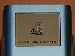 На iPod, если происходит повреждение или ошибка в оборудовании или встроенном программном обеспечении, появляется Грустный iPod. Это похоже на Sad Mac, но вместо Macintosh присутствует iPod, и нет никаких звуков смерти. У значка также нет носа, а хмурый взгляд переворачивается горизонтально. Также не отображаются шестнадцатеричные коды, указывающие, какая проблема возникла в iPod. Этот экран ошибок не отображается при возникновении проблемы в более новых iPod.