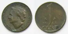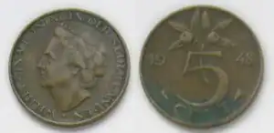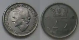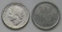 | 1 гульден | 0,45 | Королева Юлиана | 1943 | ||||||