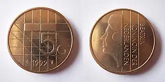 - 5 гульденов — нидерл. vijfje (последняя введена в 1987 году, заменив банкноту, продолжавшую находиться в обращении до 1995 года)