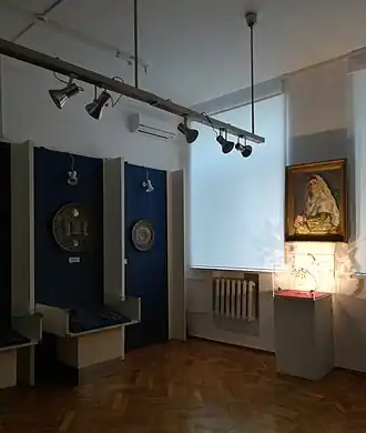В коллекции музея картины[3] В. К. Шебуева («Нищий»), И. К. Айвазовского («Буря у мыса Айя», «Морской пейзаж»), И. Н. Крамского («Портрет сестры»), Ф. С. Журавлёва («Старик»), К. В. Лемоха («Крестьянский дворик»), К. Е. Маковского («Портрет мальчика»), этюд В. И. Сурикова к картине «Боярыня Морозова», И. И. Левитана («Корниш. Юг Франции»), В. Д. Поленова («Река Ока»), К. А. Коровина («Самарканд»), А. Я. Головина («Испанка»), В. М. Васнецова («Птица Гамаюн»).