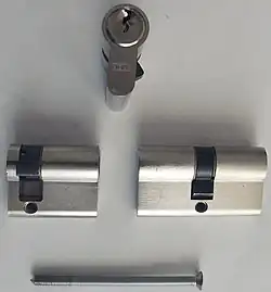 - Цилиндровые замки — в них секретный механизм собран в стандартизированный сменный узел (цилиндровый механизм секретности). Наиболее распространённой разновидностью является штифтовый замок. В нём секретный механизм представляет собой ряд подпружиненных штифтов, разрезанных на две части. Если вставлен правильный ключ, место разреза совпадёт с поверхностью цилиндра, и он может свободно поворачиваться, иначе штифты блокируют его поворот.