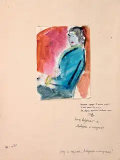 «Я пришла к Роберту Рафаиловичу. На мне был красный с синим пуловер — это тогда было очень модно. Ему это понравилось, и он сказал: „А если бы я написал Ваш портрет в этом пуловере?“, усадил меня на такой высокий стул и стал менять позы. Потом его взгляд упал на попугайчика из папье-маше… Тот был красно-зеленый, какой-то очень ярко раскрашенный. Фальк этого попугайчика схватил, дал мне в руки. Я взяла птичку, он нашел, что это получилось хорошо, и начал меня писать. Он довольно быстро закончил этот портрет, было всего несколько сеансов, и холст мне очень понравился»