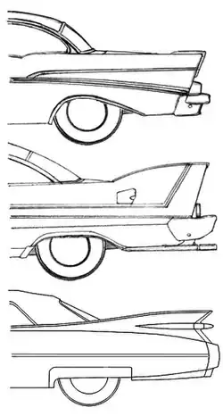 С 1957 года хвостовые плавники вместо вертикальных начинают выполнять наклонёнными наружу кузова, а их верхняя линия начинает возвышаться над линией боковины, на новом уровне возвращаясь к теме «хвостового киля» — так, что вся боковина автомобиля приобретает слегка клиновидный профиль, создающий впечатление стремительности и высоких динамических качеств. В том же году впервые применяется четырёхфарное головное освещение, которое позволило придать передку кузова лучшие пропорции, сделав автомобиль визуально более приземистым.