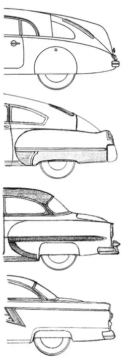 Между тем, остальные производители не торопились переходить на подобное оформление задней части, отдавая предпочтение более консервативному варианту, впервые применённому, видимо, на «Фордах» 1949 модельного года. Характерной особенностью их кузова был отказ от разделения боковой поверхности на собственно боковину и выступающий из неё объём понтона — вместо этого была применена совершенно гладкая сигарообразная боковина, доведённая по высоте до нижней линии остекления.